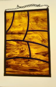 Replica naar een voorbeeld van Frank loyd Wright, 61 x 36 cm. De originele versie van dit – oorspronkelijk veel grotere – raam komt uit Hotel Lake Geneva Wisconsin USA. Het hotel is in 1910/11 gebouwd en in 1970 na een brand afgebroken. Dit is één van mijn “vroege werken”.